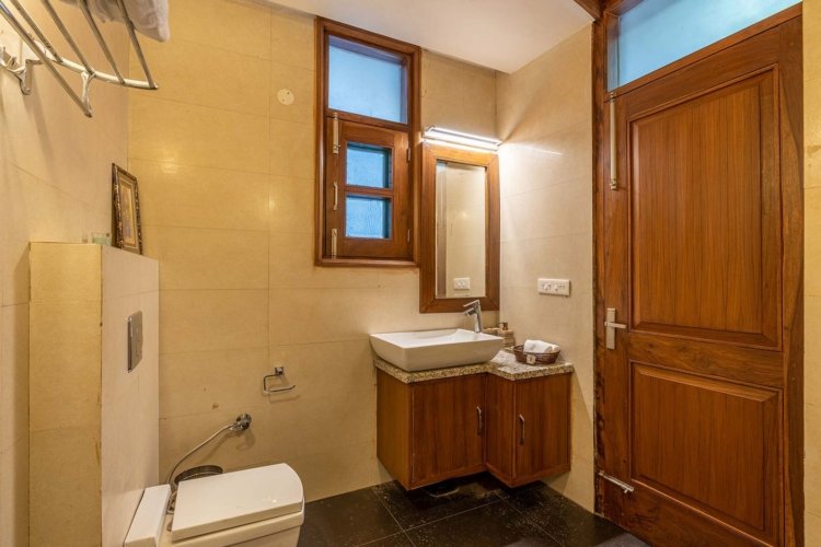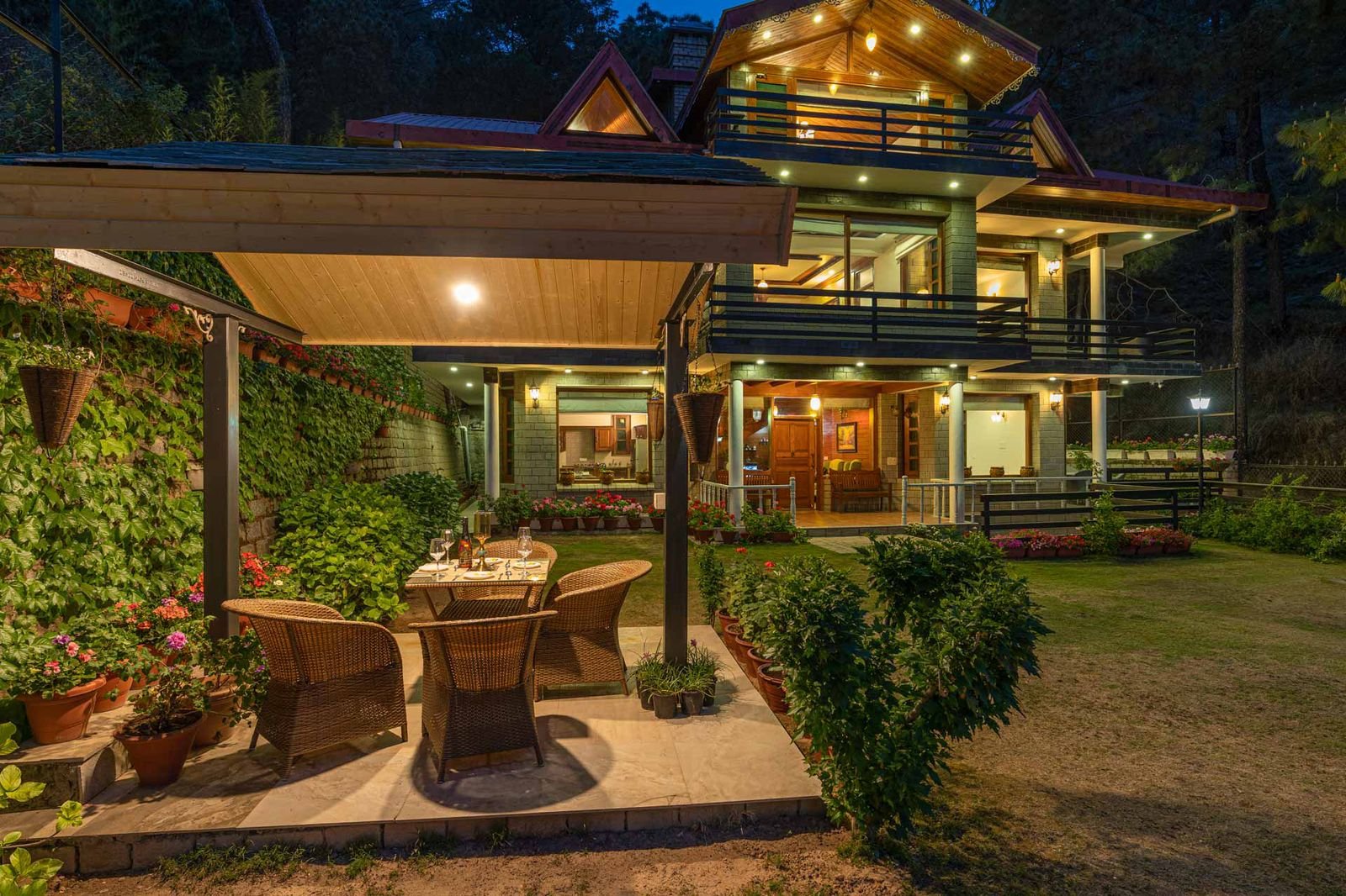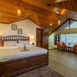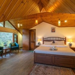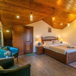 This elegant villa features beautifully appointed bedrooms, thoughtfully spread across three levels. Each room is crafted with attention to detail, offering ensuite bathrooms, warm wooden ceilings, expansive windows, cosy seating corners, and tasteful décor elements that create a perfect mountain retreat. The first-floor bedrooms open up to private balconies, unveiling breathtaking views of the Himalayan landscape.